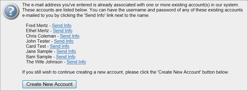 When a current user completes the New Account Request form and the email address matches an existing record, the below message displays to email the credentials to the existing record.